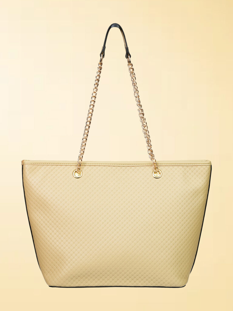 Quilted Faux Leather Tote Bag with Golden Chain Handles | Ladies Purse Handbag (Beige)